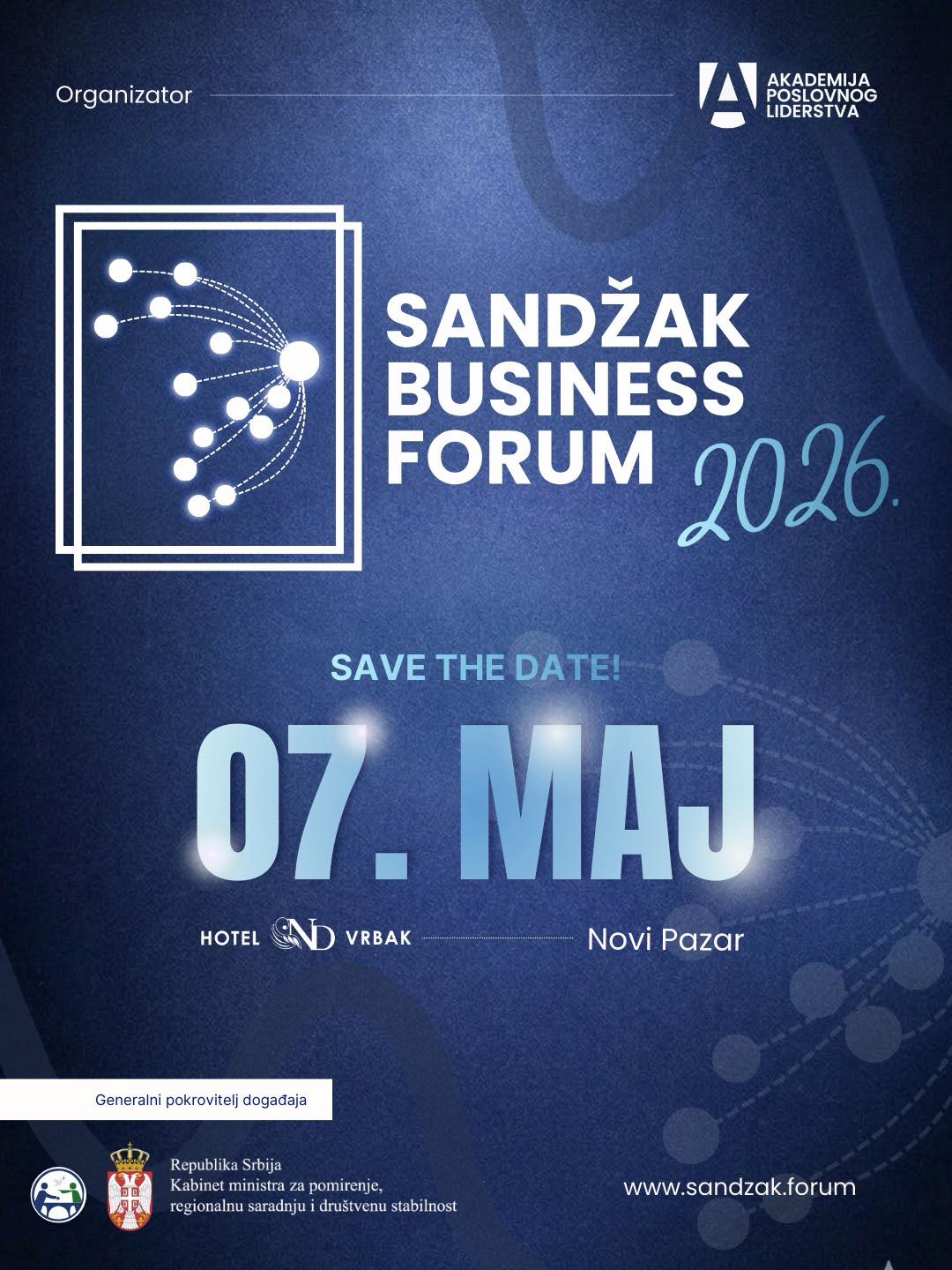 “Sandžak biznis forum je najveća poslovna konferencija koja ima tendenciju da bude tradicionalna svake godine. Cilj nam je da napravimo platformu koja će okupljati privrednike, investitore i donosioce odluka, sa ciljem poslovnog razvoja regije Sandžaka i novih investicija. Sandžak biznis forum će se održati 7. maja u hotelu Vrbak. Organizatori su Akademija poslovnog liderstva, a generalni pokrovitelj je Kabinet ministra za pomirenje, regionalnu saradnju i društvenu stabilnost, naravno uz ostale partnere, sponzore i prijatelje, koji ovu platformu vide kao mogućnost za razvoj poslovanja u ovoj regiji. Stoga pozivam ljude, privrednike i ljude sa projektima, da se prijave na našoj web stranici kako bismo napravili susrete sa potencijalnim investitorima u njihove projekte i kako bismo zajedno radili na razvoju privrede u ovim krajevima”, poručio je doc. dr. Haris Zogić, osnivač Sandžak Business Foruma.